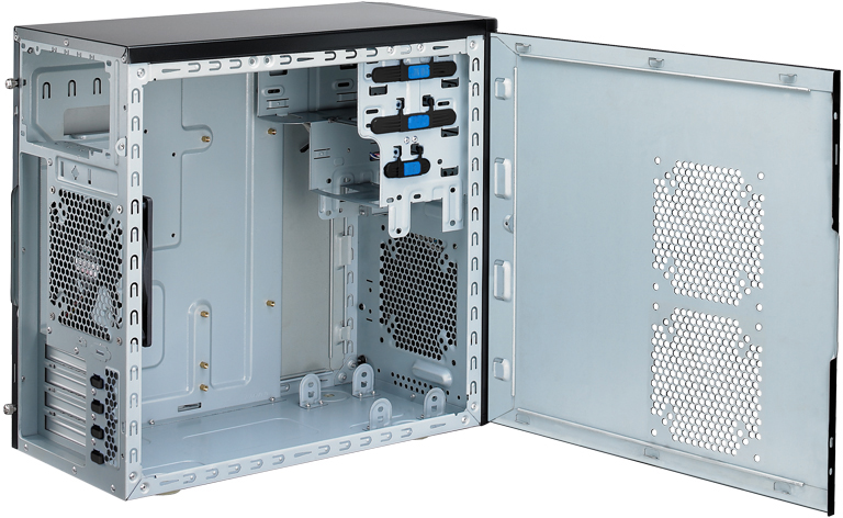 Skříň formátu Mini ATX. Dodává se se 120mm zadním ventilátorem, který se stará o vyfukování ohřátého vzduchu z počítačové skříně. Na čelním panelu jsou vyvedeny 2 konektory USB a audio konektory (sluchátka a mikrofon). Rozměry (V x Š x H): 365 x 185 x 400 mm