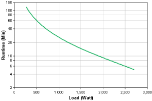 Maximální zátěž 2700W. Udávaná výdrž při zátěži 2700W je 5 minut, při 2000W je to 9 minut, při 1500W je to 15 minut, při 1000W je to 28 minut, při 700W je to 40 minut, při 500W je to 60 minut, při 250W je to 120 minut.