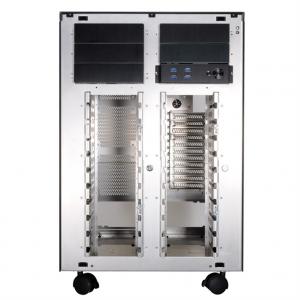 Výjimečná obří skříň dokáže svými rozměry s rezervou pojmout i základní desky rozměru HPTX. Další specialitou jsou pozice pro 20 pevných disků s možností rozšíření o další. Pro výborné možnosti chlazení je skříň možné osadit tímto množstvím ventilátorů: 6x 120 mm (vpředu), 3x 140 mm (vzadu), 3x 120/140 mm (z boku), 1x 120 mm (vzadu). Doporučujeme osazení všech předních i zadních pozic. Na čelním panelu jsou vyvedeny 4 konektory USB 3.0, možnost využití konektorů závisí na základní desce. Skříň nemá čelní audio konektory.
